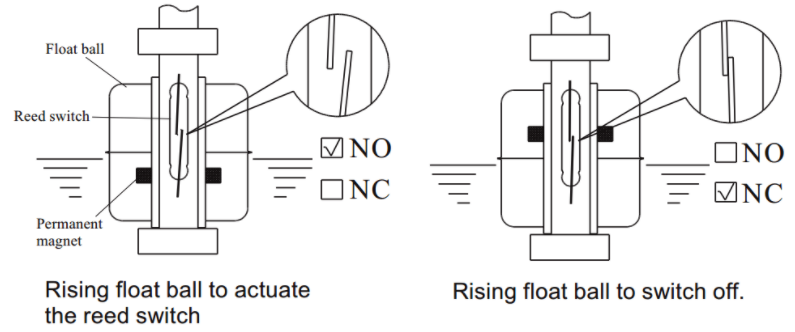 Side Mounted는 Float가 물에 뜨면, 부력체 Lever 및 Body 내부에 부착된 영구자석에 의해 limit switch를 누르는 형식으로 되어 있습니다.