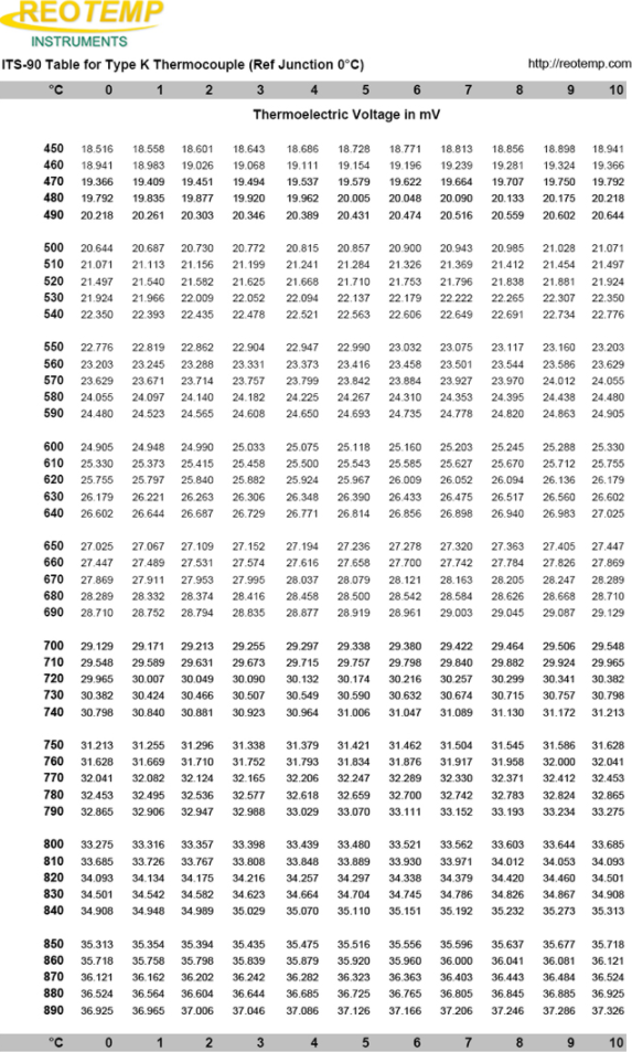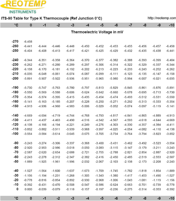 아래는 Thermocouple K Type의 온도별 전압변화를 나타낸 테이블입니다.