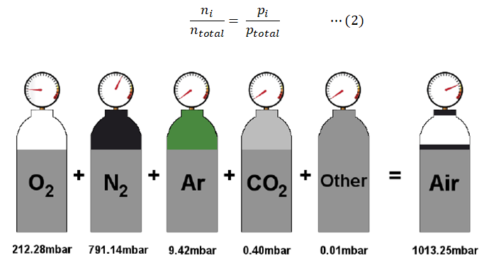(1)번 식으로부터, 우리는 가스 혼합물 내에서 부분 가스가 차지하는 비율이 해당 가스의 총 압력에 대한 부분 압력의 비율과 같다는 것을 알 수 있습니다.