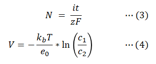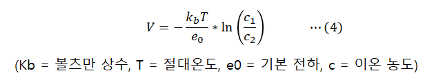 이 때, 발생하는 전압은 네른스트 방정식(Nernst Equation)을 따릅니다.