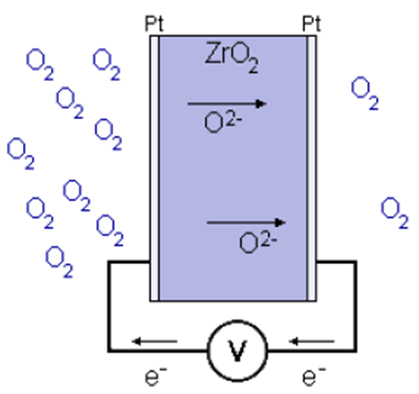 위에서 설명 한 바와 같이 ZrO2는 고체이지만 O2에 대하여 전해질과 같은 역할을 수행합니다.