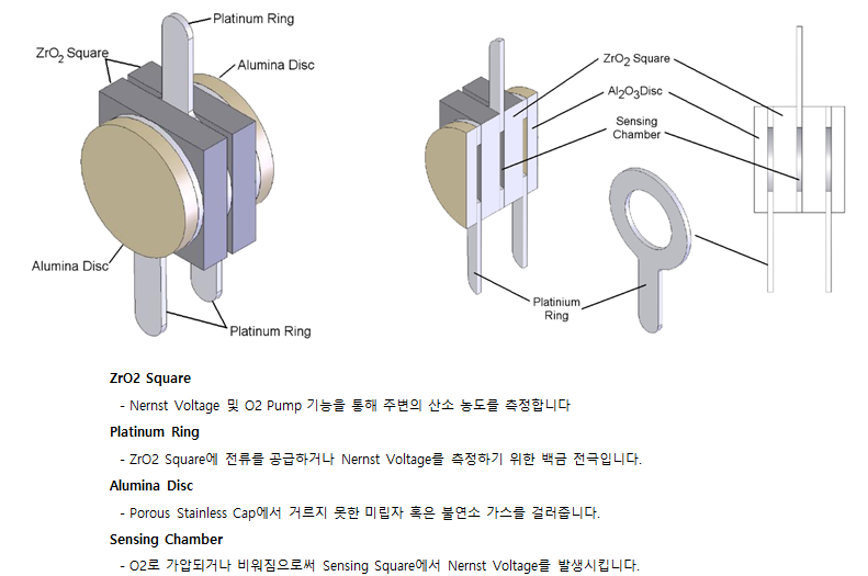 두 번째 ZrO2 Square는 Sensing Chamber와 외부의 O2 Pressure의 차이로 인해 Nernst Voltage가 발생합니다.