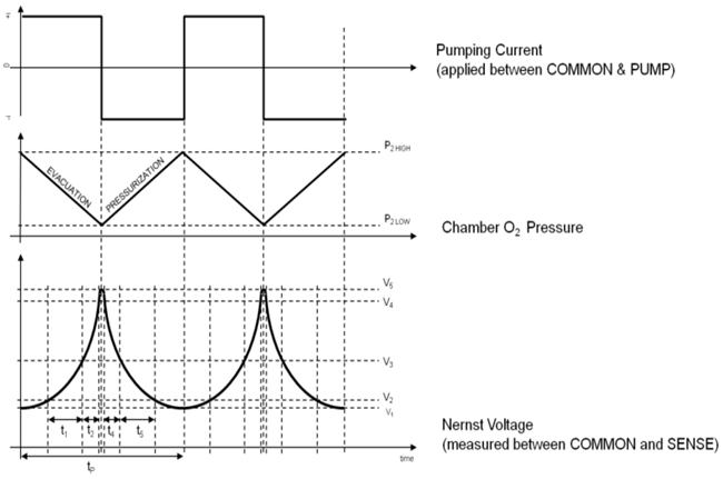 Interface Board에서는 2개의 기준 전압(V1, V5)을 설정합니다. 이후 정전류 전원에 의한 O2 Pumping으로 Nernst Voltage가 발생하며, 이 전압이 기준 전압에 도달 할 때 마다 Board에서 정전류 전원의 극성을 반전시킵니다.