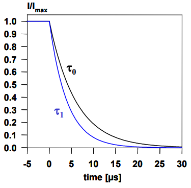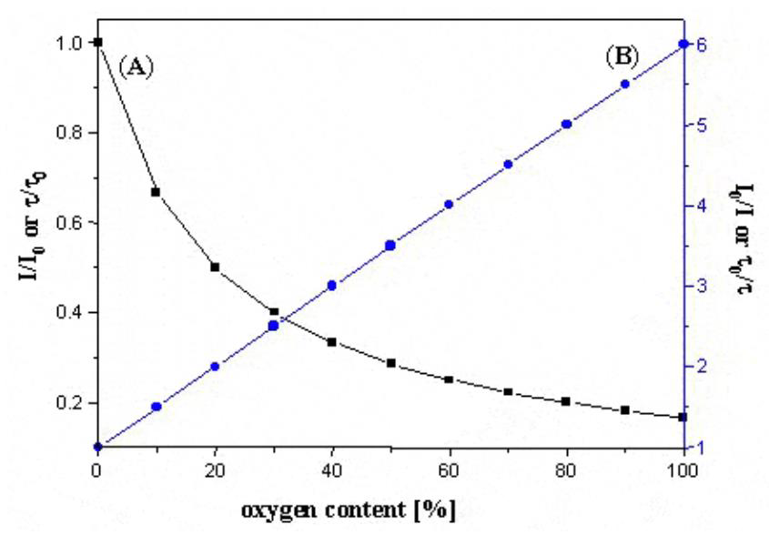 위의 식을 보면, 산소의 농도가 증가할 수록 임의의 산소 농도에서의 형광 세기 𝐼 및 형광 수명 𝜏 는 계속 감소하는 것을 볼 수 있습니다. 위 식을 그래프로 표현하면 아래와 같습니다.