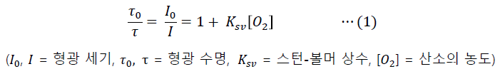 일반적으로 Quenching(소광)을 이용한 광 산소센서는 산소의 농도를 측정하기 위하여 스턴-볼머 방정식을 사용합니다.