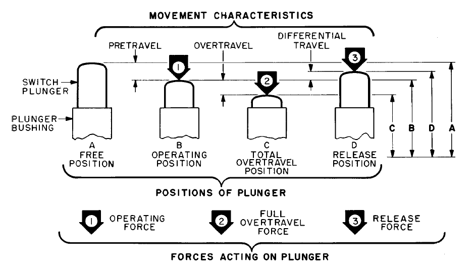 - Differential Travel (D.T.) : 스위치 On 이후, 다시 Off가 되기 위해서는 플런저가 Operating Position보다 더 많이 복귀해야 합니다. 여기서, Operating Position과 OFF되는 지점(Release Position)의 차이.