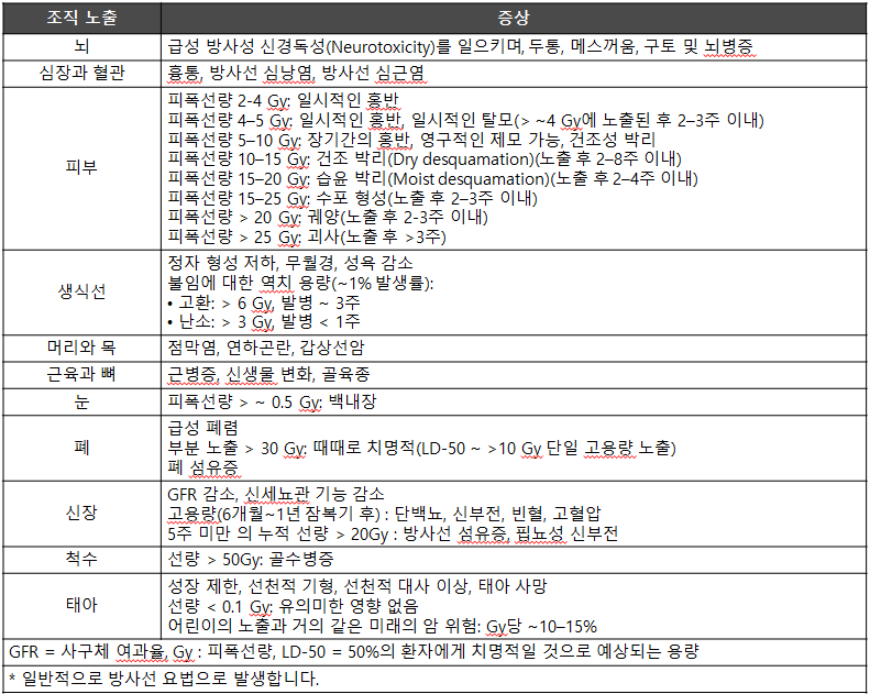방사선 피폭은 국소 방사선 손상과 급성 방사선 증후군(ARS)를 발생시킵니다.