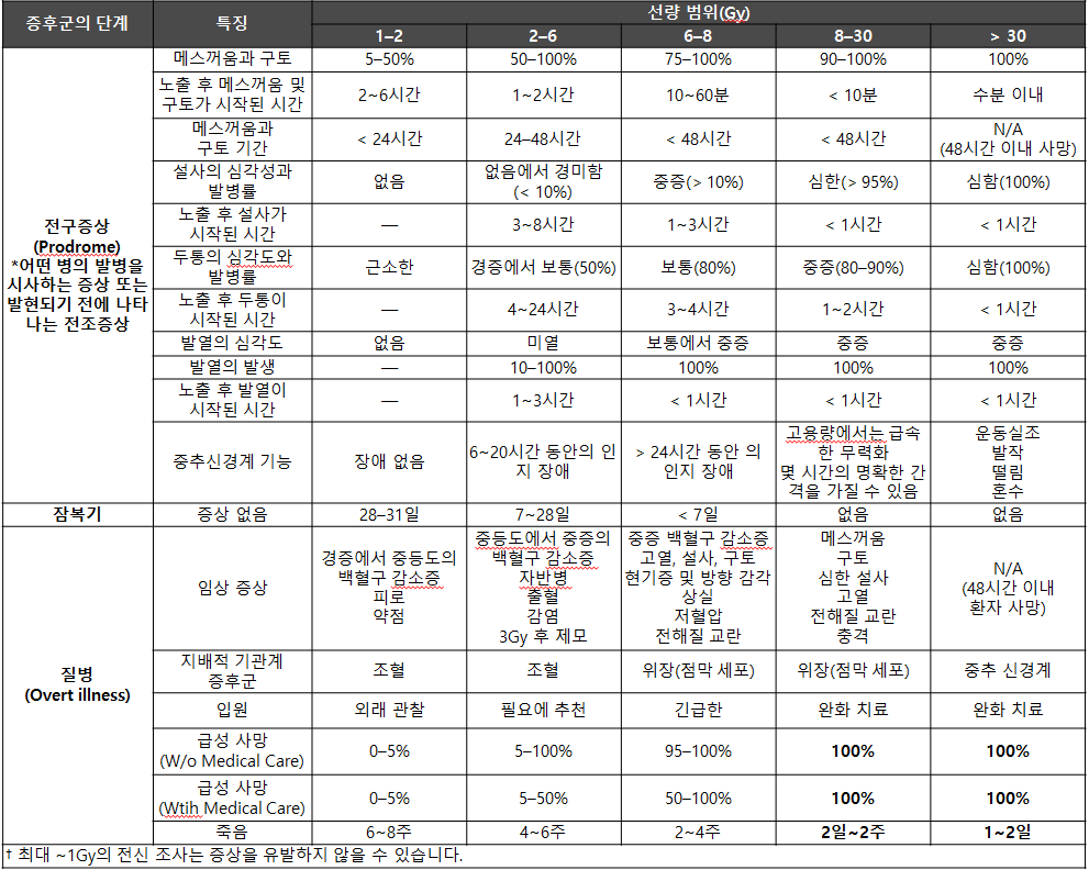 하지만, 일정량 이상 대량의 방사선에 노출될 경우 결정적으로 구토, 설사, 고열, 백혈구 감소증 등 가시적인 증상이 발생하게 되며, 심한 경우 48시간 이내 사망하게 됩니다.