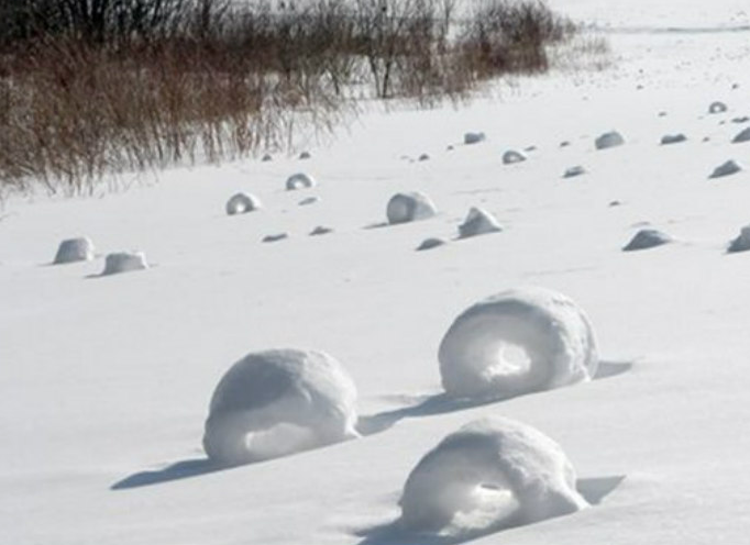지역/국가에 따라 Snow Bales, Snow Donuts, Snownuts, Wind Snowballs 등으로 불리우며, 사람이 만든 눈덩이와는 달리 가운데가 비어있는 원통형으로 매우 약한 구조로 되어 있습니다.