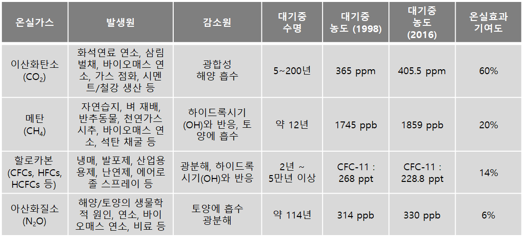 주요 인위적 온실가스 배출의 주요 요인은 아래 표와 같습니다.