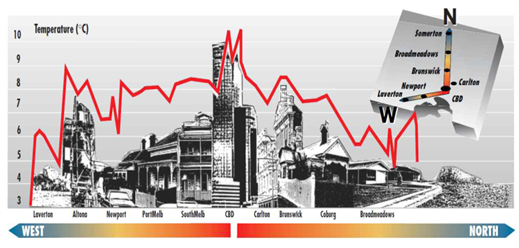도시가 성장함에 따라 산업 공정, 가정 난방 및 자동차의 방출 열이 높아지고, 콘크리트로 덮이게 되므로 도시화가 진행될수록 평균 기온은 급격히 증가합니다.