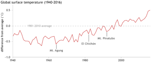 아래 그래프는 지난 80여년간 온도 변화를 나타내며, Mt. Agung, El Chichon, Pinatubo 화산 폭발로 인한 평균 기온 하락을 나타냅니다.