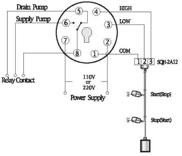 콘트롤러는 이 접점을 받아 설정된 ON/OFF 로직에 따라 5-8번, 6-8번 접점이 ON/OFF 되며, 이 접점으로 펌푸 구동용 컨택트를 온오프 시키게 됩니다.