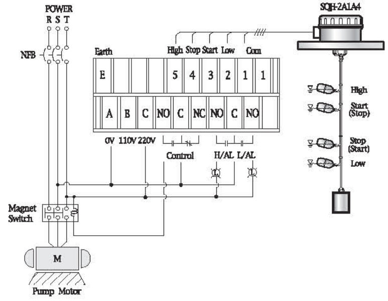 1-2, 1-5번 단자가 붙으면 High/Low Alarm이 울리며, 1-3, 1-4번 단자가 붙으면 펌프 구동용 접점이 ON/OFF 됩니다.