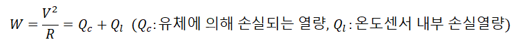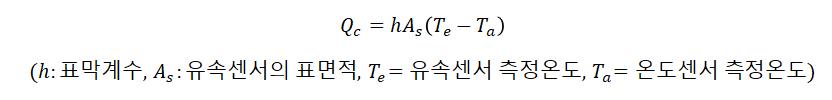 유량센서에서 전기에너지 E를 가하였을 경우, 발생하는 열량은 아래와 같습니다.