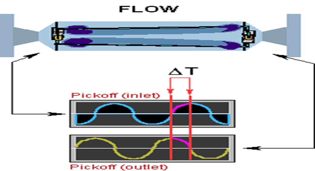 하지만, 유체가 흐르게 되면 유체의 질량에 의한 관성으로 인해 Outlet 쪽의 Pick off가 먼저 떨어지고, Inlet 쪽의 Pickoff가 조금 늦게 떨어지게 됩니다.