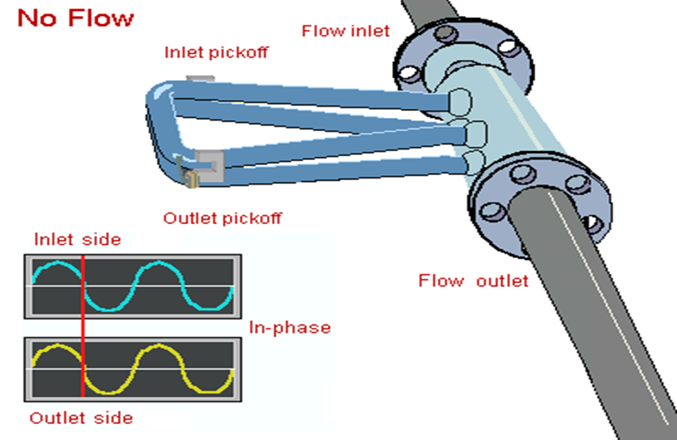 유체가 흐르지 않을 시에는 Inlet Side와 Outlet Side의 Pick off의 출력이 동일한 위상으로 나타납니다.