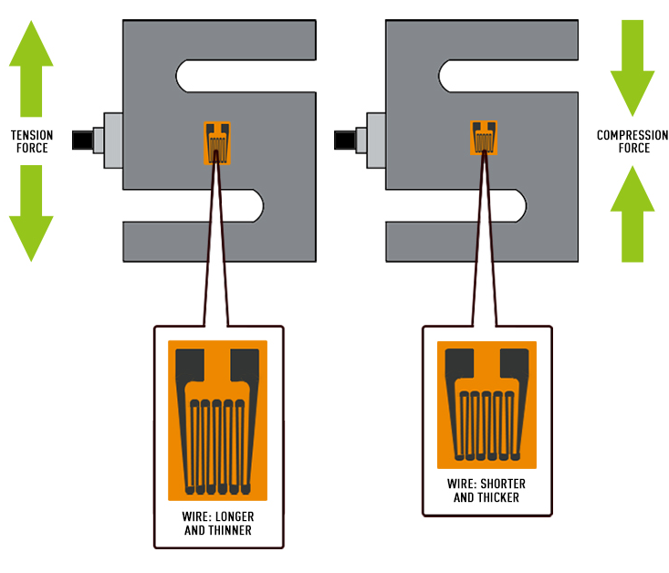 스트레인 게이지는 매우 민감하게 변화하는 저항체이며, 인장력이 걸려 길이가 늘어나면 저항이 커지고, 압축력에 의해 길이가 줄어들면 저항이 작아지는 것을 측정할 수 있습니다. (R=L/A 이므로)