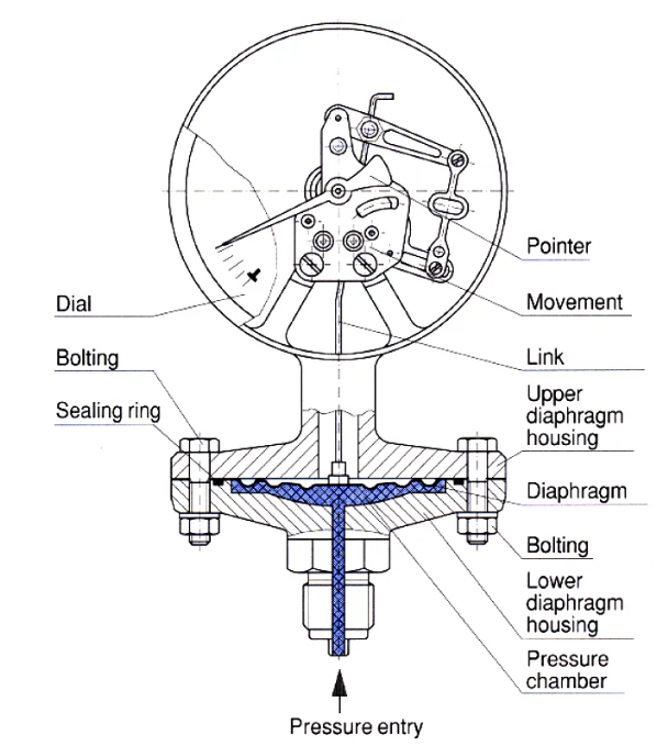 기타 기구적 구조는 부르동관과 큰 차이는 없으며, 압력에 의한 다이아프램의 휨새가 링크를 통해 무브먼트로 전달됩니다.