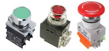 누름식 스위치 입니다. 램프가 같이 들어있는 제품이 많으며, 긴급 상황에 뛰어가서 대충 쳐서 누르기만 하면 되기에 비상정지 스위치로도 많이 활용됩니다. (하기 사진 중 가장 우측)